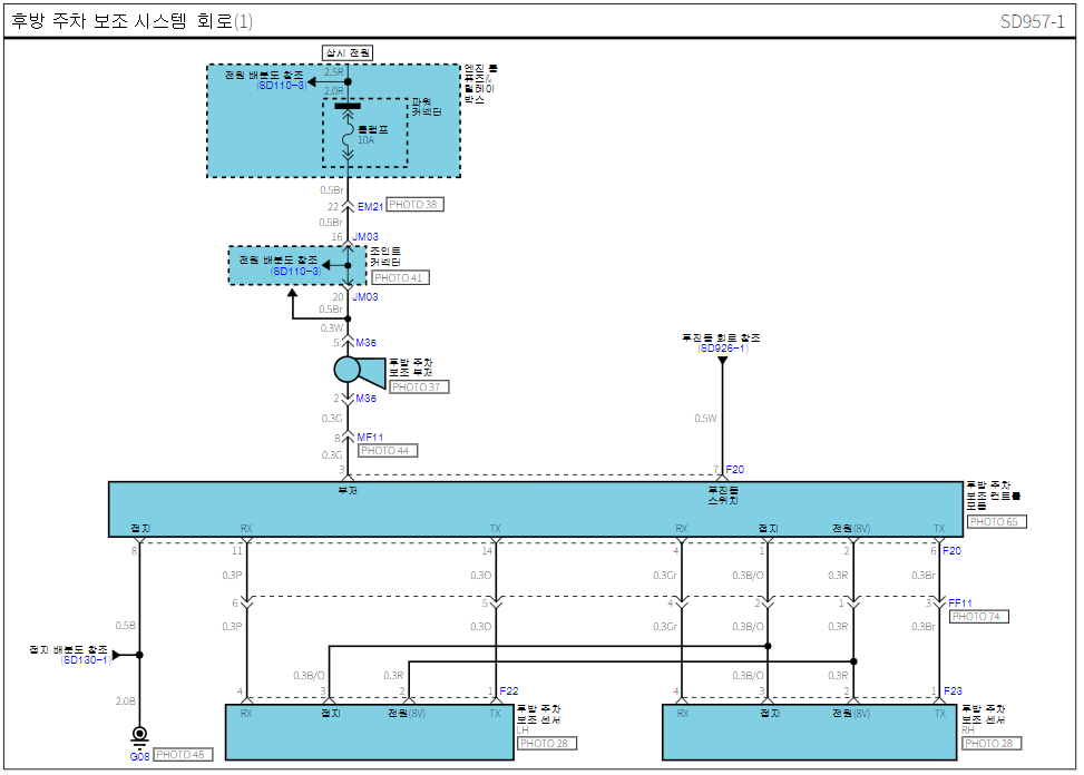 후방 컨트럴 모듈에서는 후방감지기로 가는 선 6개와 접지선 1개, 정션박스로 가는 1개선과 후진 신호등으로 가는 선 1개만 연결하면 됩니다.